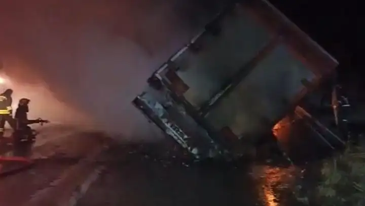 Edinilen bilgilere göre, dün gece saatlerinde ilçenin Oğlaklı Mahallesi'nde sürücüsünün direksiyon hakimiyetini kaybettiği tır, yol kenarına devrilerek alev aldı. Sürücü, hafif şekilde yaralandı.