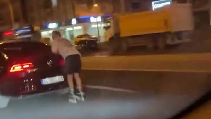 Diyarbakır'da patenli genç, akşam saatlerinde bir aracın arkasına tutunarak ilerledi. Yürekleri ağızlara getiren anlar cep telefonu kamerasına yansıdı.