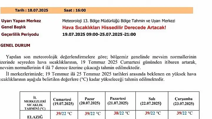 Meteoroloji 13. Bölge Müdürlüğü'nden yapılan açıklamada, 'Yapılan son meteorolojik değerlendirmelere göre, bölgemiz genelinde mevsim normallerinin üzerinde seyreden hava sıcaklıklarının, 19 Temmuz 2025 Cumartesi gününden itibaren artarak, mevsim normallerinin 4 ila 7 derece üzerine çıkacağı tahmin edilmektedir. Sıcaklıklardaki yükselişe bağlı olarak güneş ışınlarının dik geldiği 11 ile 16 saatleri arasında başta yaşlılar, çocuklar ve kronik rahatsızlığı olan vatandaşlarımızın sıcak çarpmasına karşı dikkatli ve tedbirli olmaları önem arz etmektedir' denildi.