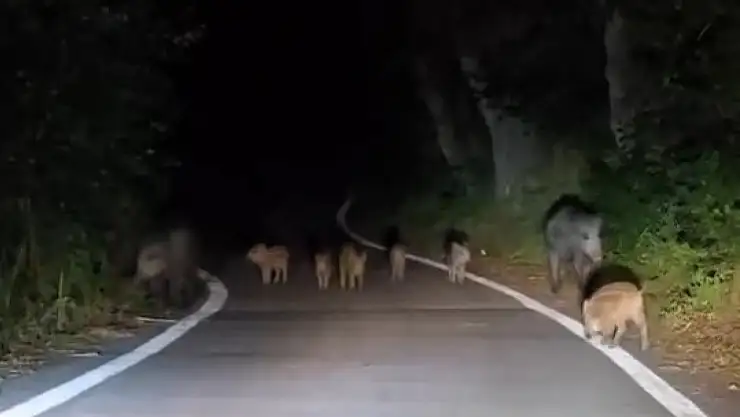 Elazığ’ın Sivrice ilçesinde domuzlar ve yavruları köy yoluna indi. Domuz ve yavruları, aracın gelişine aldırış etmezken, sürücü bir süre beklemek zorunda kaldı. Domuzlar bir süre sonra ormanlık alana giderek gözden kaybolurken sürücü ise yoluna devam etti. O anlar cep telefonu kamerasına yansıdı.